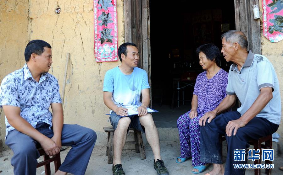在江西永新县三湾乡三湾村,邢镭(左二)在74岁的村民段老金家里了解土坯房改造情况(2013年8月10日摄)。邢镭来自湖北,在三湾乡扎根9年,2017年他刚刚带领三湾乡脱贫摘帽。新华社记者 周科 摄
